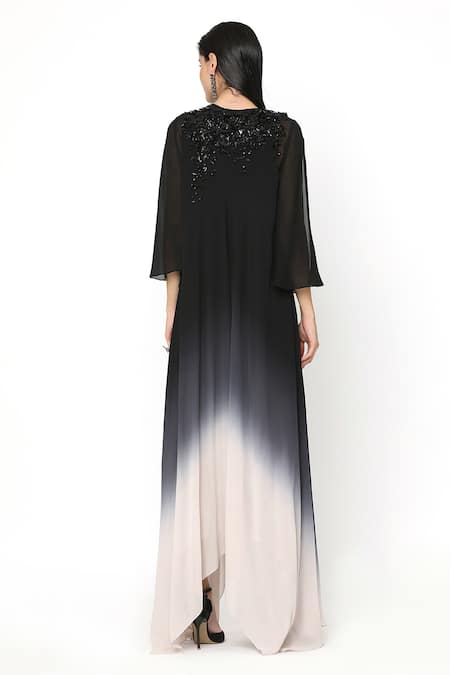 Black ombre gown featuring a round neckline and slit cape sleeves