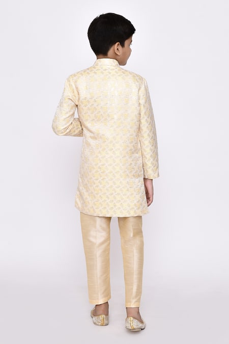 Buy_Petite Pomme_Yellow Jacquard, Silk Sequins, Embroidery Abstract Jacket Sherwani Set _at_Aza_Fashions
