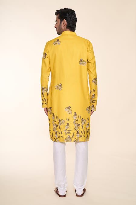Yellow kurta featuring an abstract flying bird print with full sleeves and a mandarin neckline