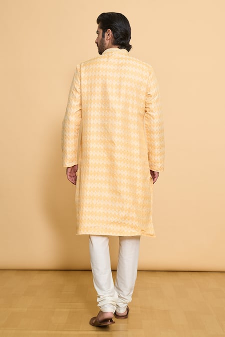 Yellow kurta featuring an all-over mandala pattern with a stand collar and full sleeves. Paired with a matching churidar made from polyester.