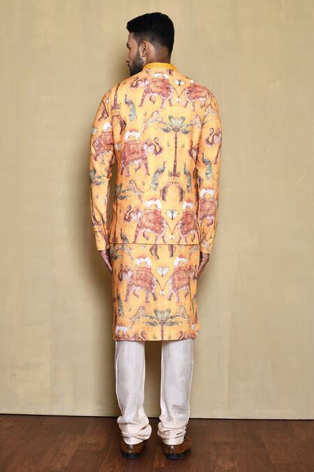 Buy_Arihant Rai Sinha_Yellow Silk Embroidery Animal Print Bundi Kurta Set_at_Aza_Fashions