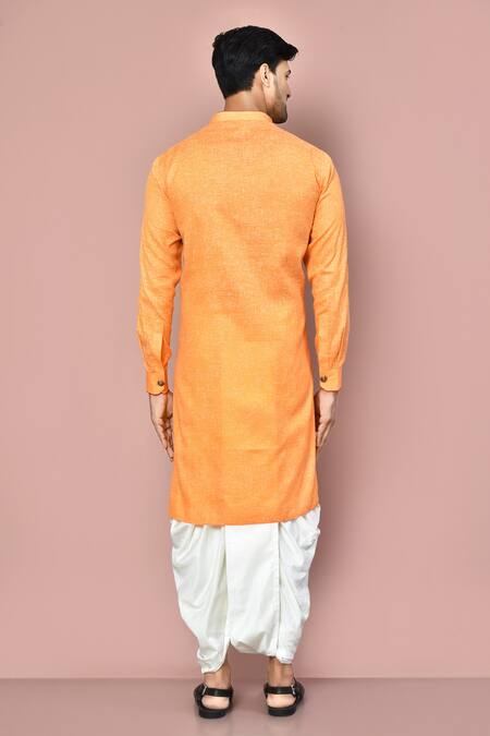 Orange asymmetric hemline kurta featuring a round collar and full sleeves. Paired with a dhoti pant, this set is crafted from cotton fabric.