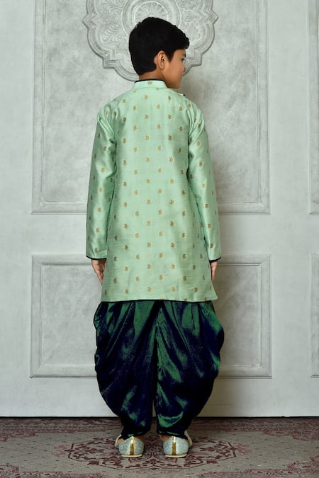 Bottle green overlap kurta featuring paisley pattern and round collar. Paired with a matching patiala pant with a relaxed fit.