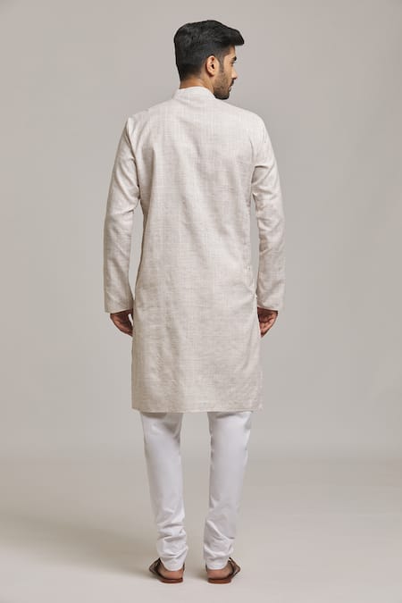 Grey cotton linen kurta featuring a band collar, side slits, and full sleeves. Paired with a white pyjama with a concealed zip and drawstring.