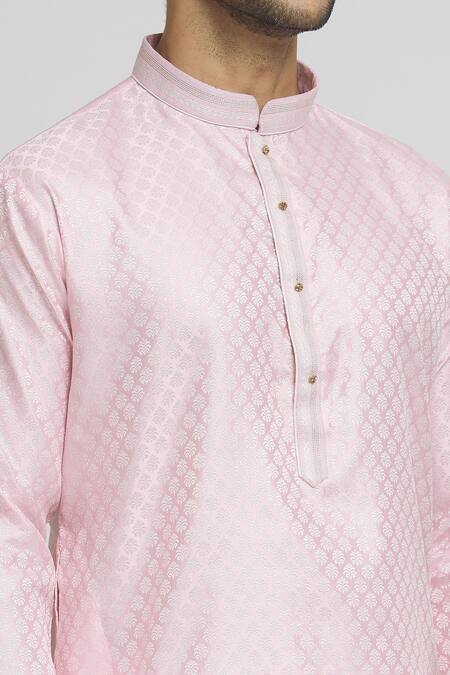 Baby pink silk blend kurta featuring a band collar, long sleeves, and embroidered placket. Paired with a white churidar for a complete look.