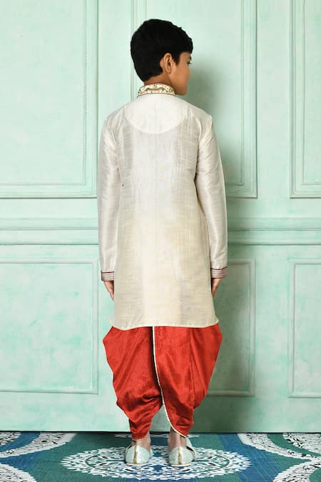 Off white kurta featuring full sleeves, mandarin neckline, and bead & stone work. Paired with a red dhoti pant for a festive look.