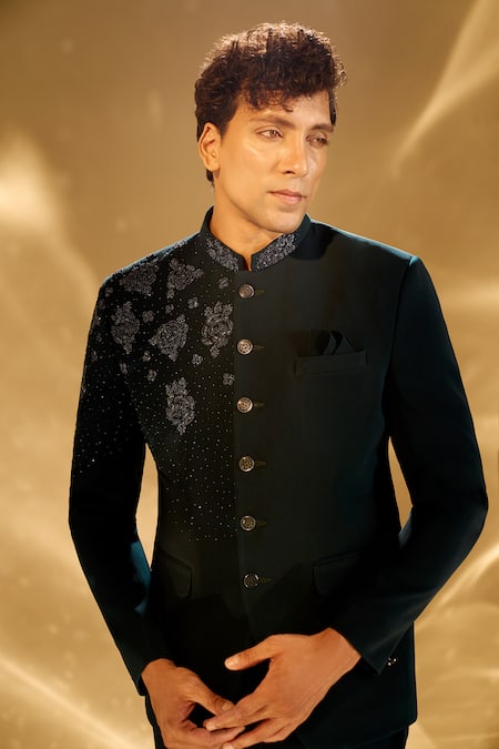 The Bandhgala features floral and geometric embroidered patterns.