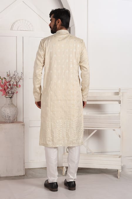 Beige Silk Embroidery Kurta Set With Aligadhi Pant