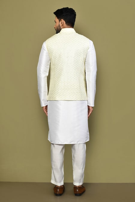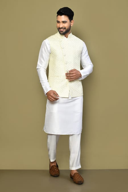 Beige sleeveless bundi featuring thread and sequin embroidery in a hexagon pattern and a mandarin collar