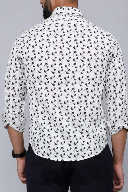 White Cotton Bird Print Collared Shirt