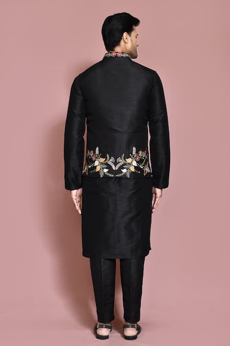 Black kurta featuring full sleeves and front button placket. Paired with a nehru jacket adorned with multi-color leaf and floral motif resham thread embroidery and a solid pyjama.