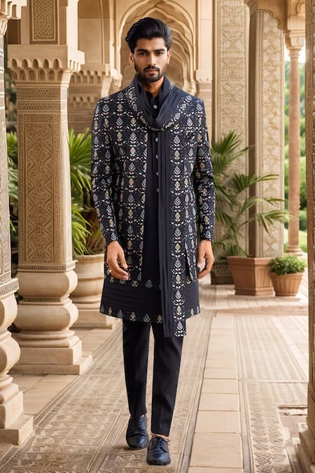 Black jacket featuring thread, sequin, bead, and cutdana embroidery in a floral pattern. Paired with a pleated border embroidered sherwani, aligadhi pant, and stole.