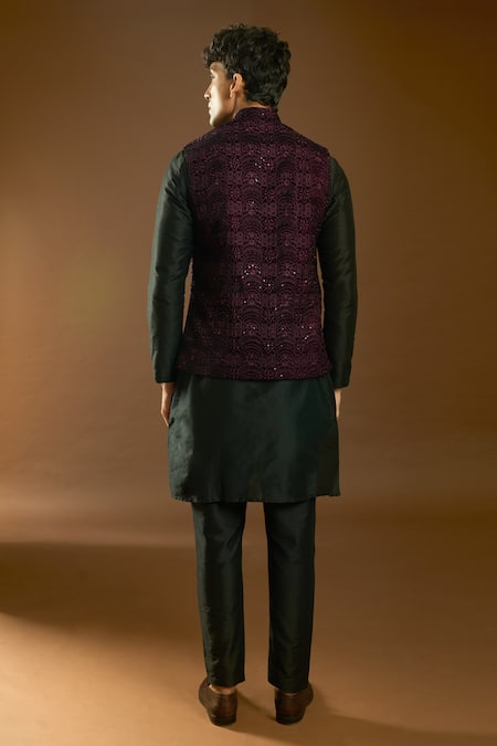 Purple bundi in velvet featuring all over bloom art thread embroidery and front welt pockets