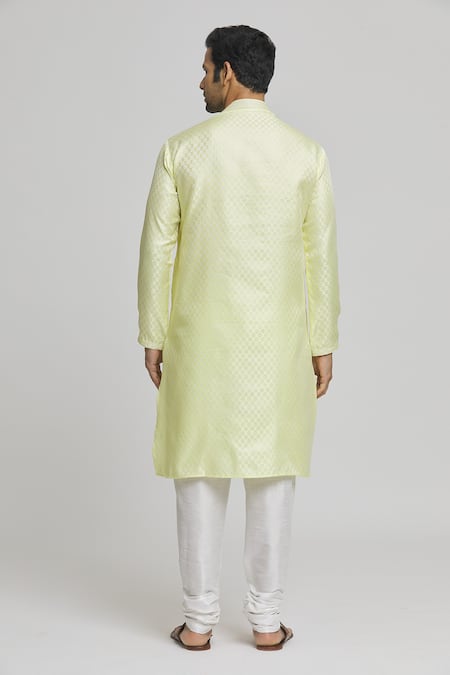 Lemon yellow kurta in a silk blend featuring full sleeves and a bloom motif pattern. Paired with a white churidar for a complete look.