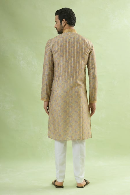 Yellow kurta featuring full sleeves and a mandarin collar with a bloomy print. Paired with a matching pant for a complete look.