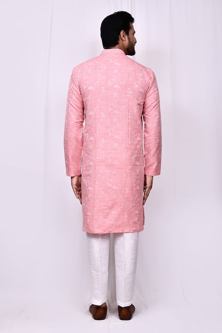 Pink Cotton, Silk Embroidery Blossom Print Sherwani With Pant Pyjama