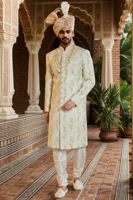 Pista green sherwani featuring full sleeves and band collar with all over blossom vine thread embroidery and sequin highlights. Paired with a churidar and an embroidered border stole.