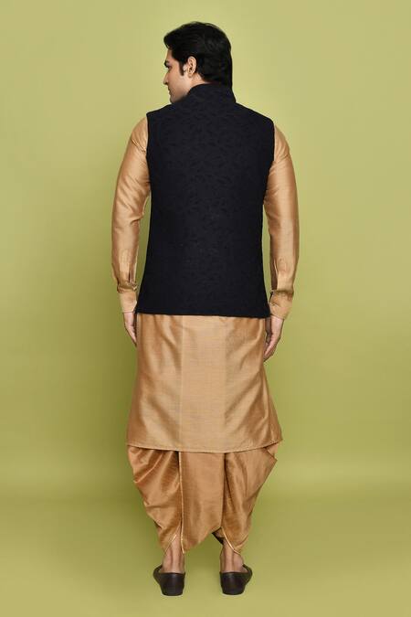 Navy blue velvet bundi featuring abstract patterns. Paired with a solid beige kurta and dhoti pant.