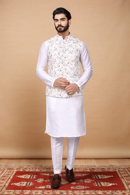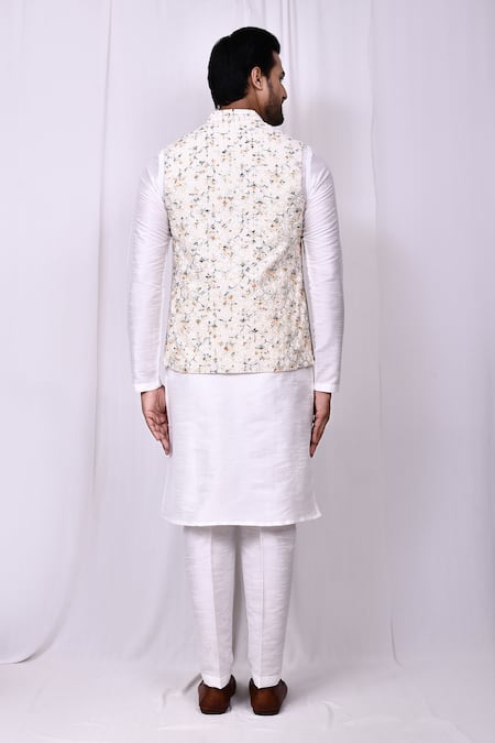 Cream bundi featuring botanic printed motifs and threadwork details. Paired with a matching kurta and pant pyjama.