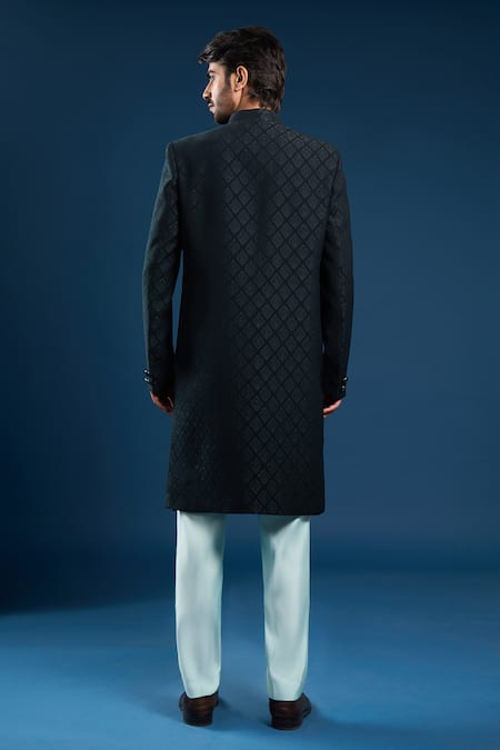 Self-weaving pattern on sherwani fabric., Buttoned front with a sleek design., Chest pocket detail on the sherwani.
