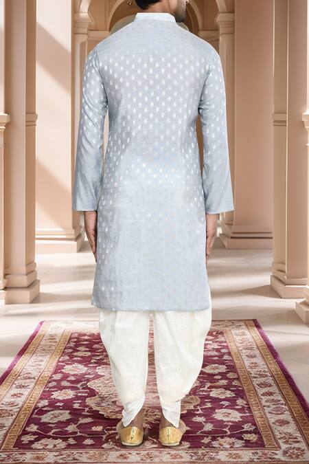 Light grey woven brocade kurta featuring a band collar and long sleeves with a buttoned placket. Paired with an off-white art silk patiala.