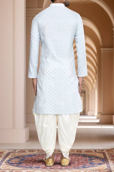Powder blue woven brocade kurta featuring a band collar and buttoned placket. Paired with an off white art silk patiala.