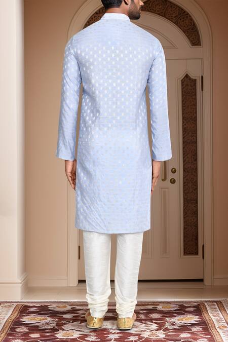 Sky blue kurta featuring geometric brocade woven motifs and a mandarin collar. Paired with an off-white churidar with a drawstring closure.