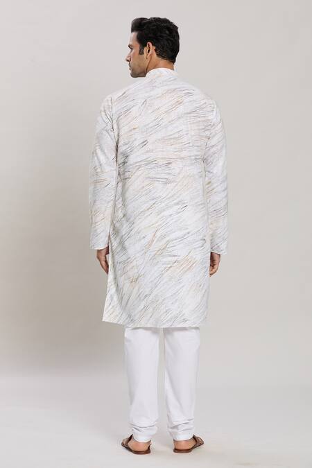 White kurta featuring a brush print design with a band collar and long sleeves. Paired with a churidar made from pure cotton for a comfortable fit.
