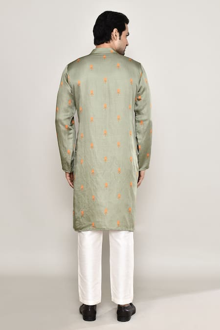 Green kurta featuring full sleeves, band collar, and all-over bullian bloom motif print