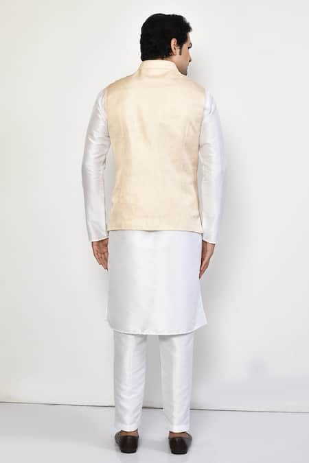 Beige sleeveless bundi featuring an all-over carnation bloom print. Paired with a white full sleeves plain kurta and pant.