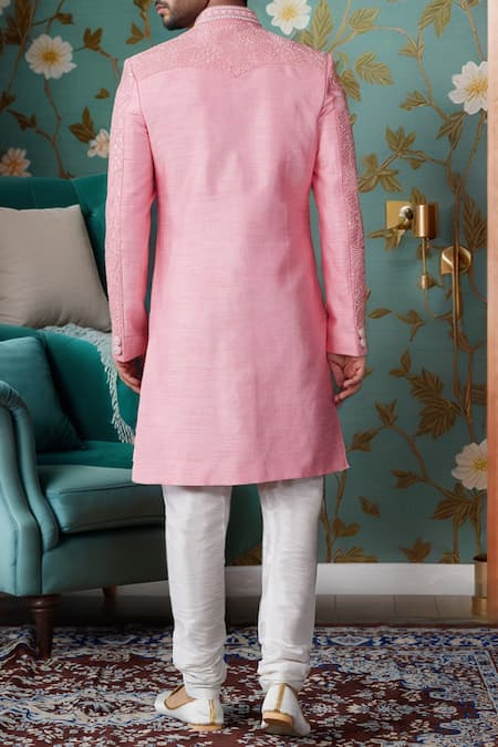 Pink sherwani featuring full sleeves and mandarin collar with celeste blossom embroidery. Paired with an off white churidar for a complete look.
