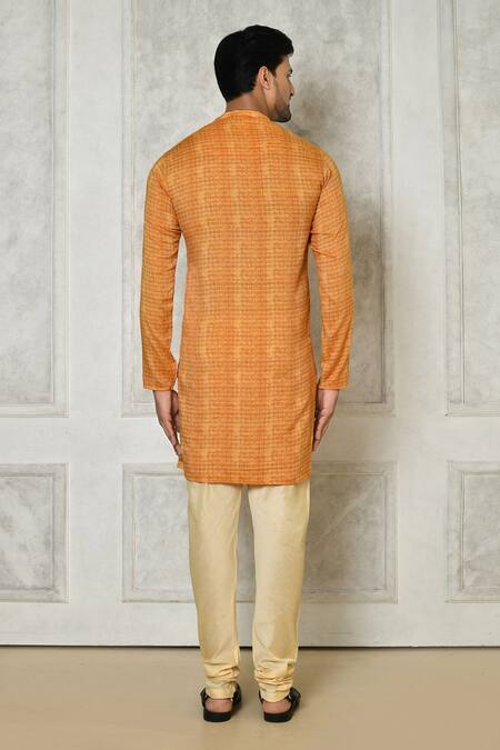 Orange kurta featuring a checkered print, mandarin collar, and full sleeves. Paired with a beige churidar with front drawstrings.
