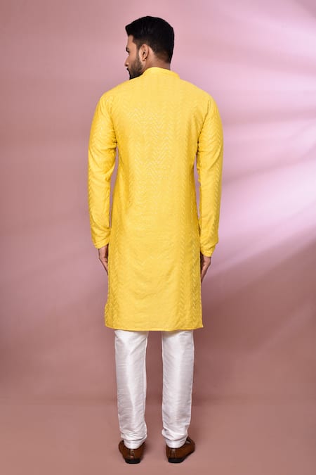 Yellow kurta featuring all-over geometric chevron pattern embroidery. Paired with a white churidar with drawstring closure.