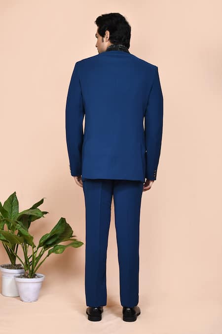 Royal blue suit featuring chevron pattern cutdana and thread embroidery on the placket. Paired with a full sleeve embroidered shirt, straight pant, and sleeveless waistcoat, complete with a bow tie, pocket square, and brooch.