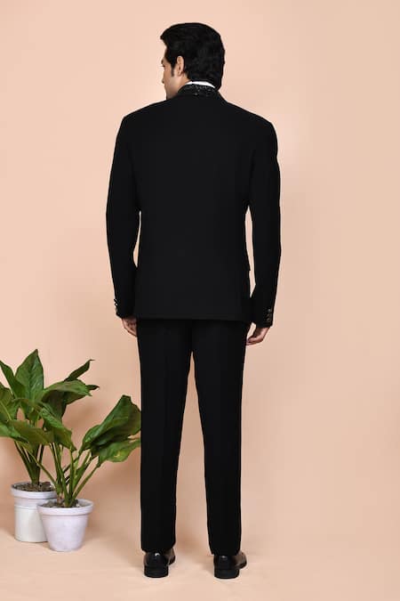 Black suit set featuring chevron embroidered placket with cutdana and thread work. Includes a full sleeve embroidered shirt, straight pant, and sleeveless waistcoat, complemented by a bow tie, pocket square, and brooch.