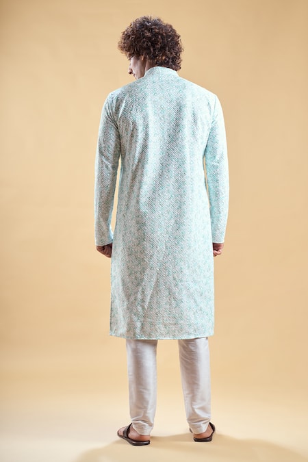 Green kurta featuring chikankari thread embroidery and line print detailing. Paired with a coordinating solid churidar.