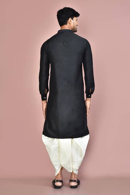 Black kurta featuring a mandarin collar and full sleeves with front button detailing. Paired with an off-white dhoti pant that complements the kurta's simplicity.