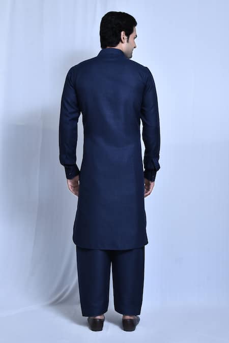 Navy blue full sleeve kurta featuring a collared neckline and side slits. Paired with matching pathani pants for a complete look.