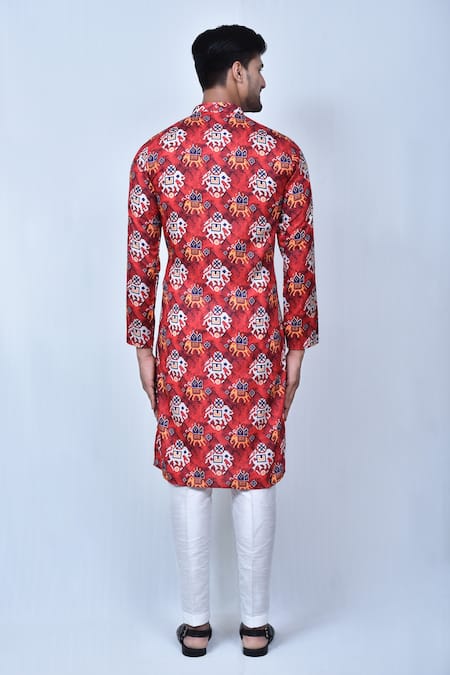 Orange kurta featuring elephant patola prints and a Mandarin collar. Paired with off-white elasticated pant.