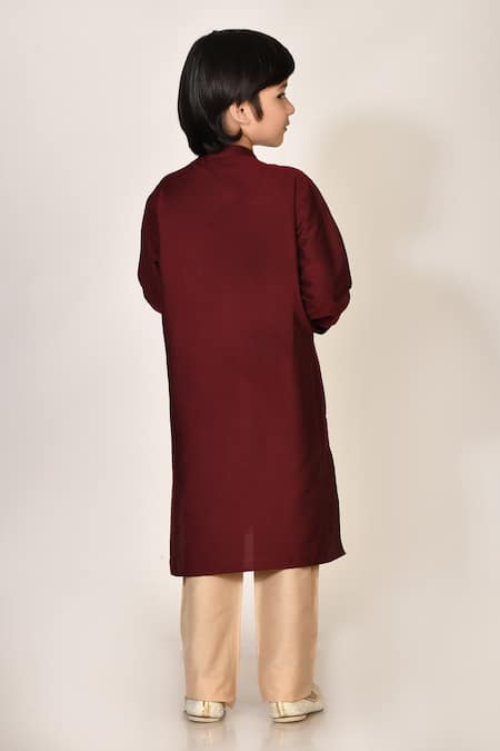 Maroon kurta featuring full sleeves, band neckline, and button front closure. Paired with straight pants with a semi-elasticated waistband.