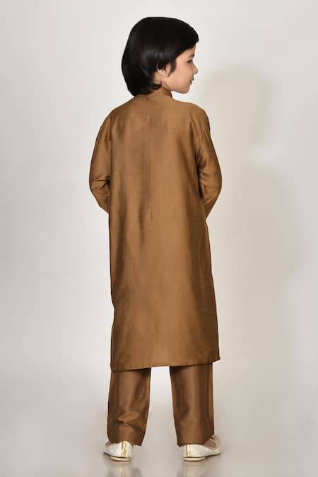 Brown kurta featuring woven motifs on the placket and cuffs. Paired with straight pants with a semi-elasticated waistband.