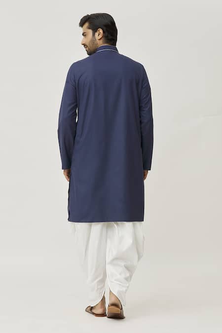 Navy blue cotton kurta featuring a mandarin collar and front button closure. Paired with an off-white dhoti pant for a traditional look.