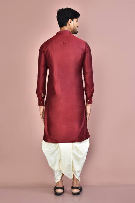 Maroon kurta featuring a mandarin collar and full sleeves. Paired with an off-white dhoti pant.