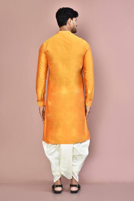 Yellow kurta featuring a mandarin collar and full sleeves. Paired with an off-white dhoti pant.