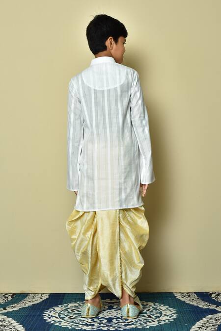 White stripe pattern kurta featuring a stand collar and full sleeves with a half button placket. Paired with a beige dhoti, this set is crafted from cotton for comfort.