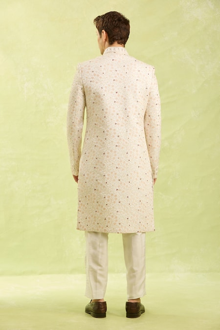 Cream sherwani featuring all-over hand embroidery on art silk with a button closure. Paired with off-white half elastic pants in dupion art silk.