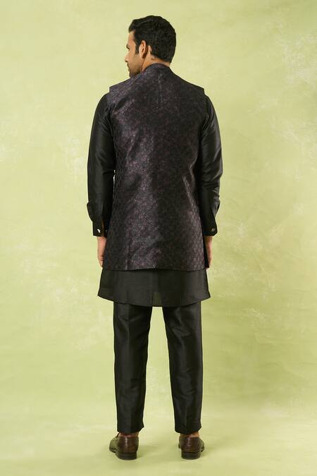 Black sleeveless bundi featuring crest jaal woven detailing. Paired with a solid black kurta and polo pant in a silk blend.