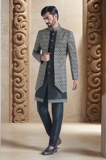 Black layered sherwani featuring crest vine thread embroidery and full sleeves. Paired with a churidar made from art silk and jacquard fabric.