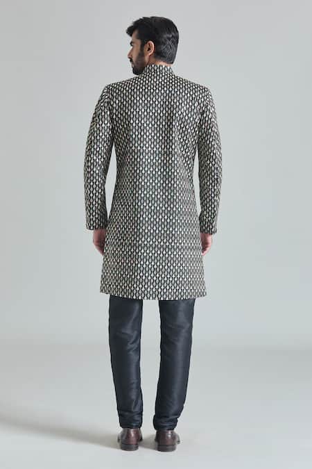 Black Jacquard, Silk, Satin Crest Vine Layered Sherwani With Churidar