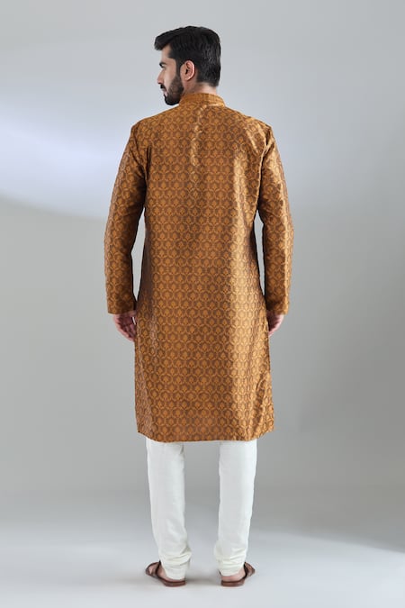 Mustard yellow kurta featuring full sleeves and a mandarin collar with crest woven detailing. Paired with a matching churidar for a complete look.